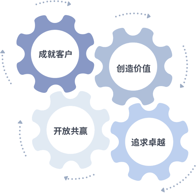 成就客户是一切决策的出发点,,创造价值是衡量所有工作的标准,,,,追求卓越是我们做事做人的态度,,,,开放共赢是我们的格局也是最终的结果。。。价值观的齿轮环环相扣,,,,推动着组织里的每个人不断向前。。。。